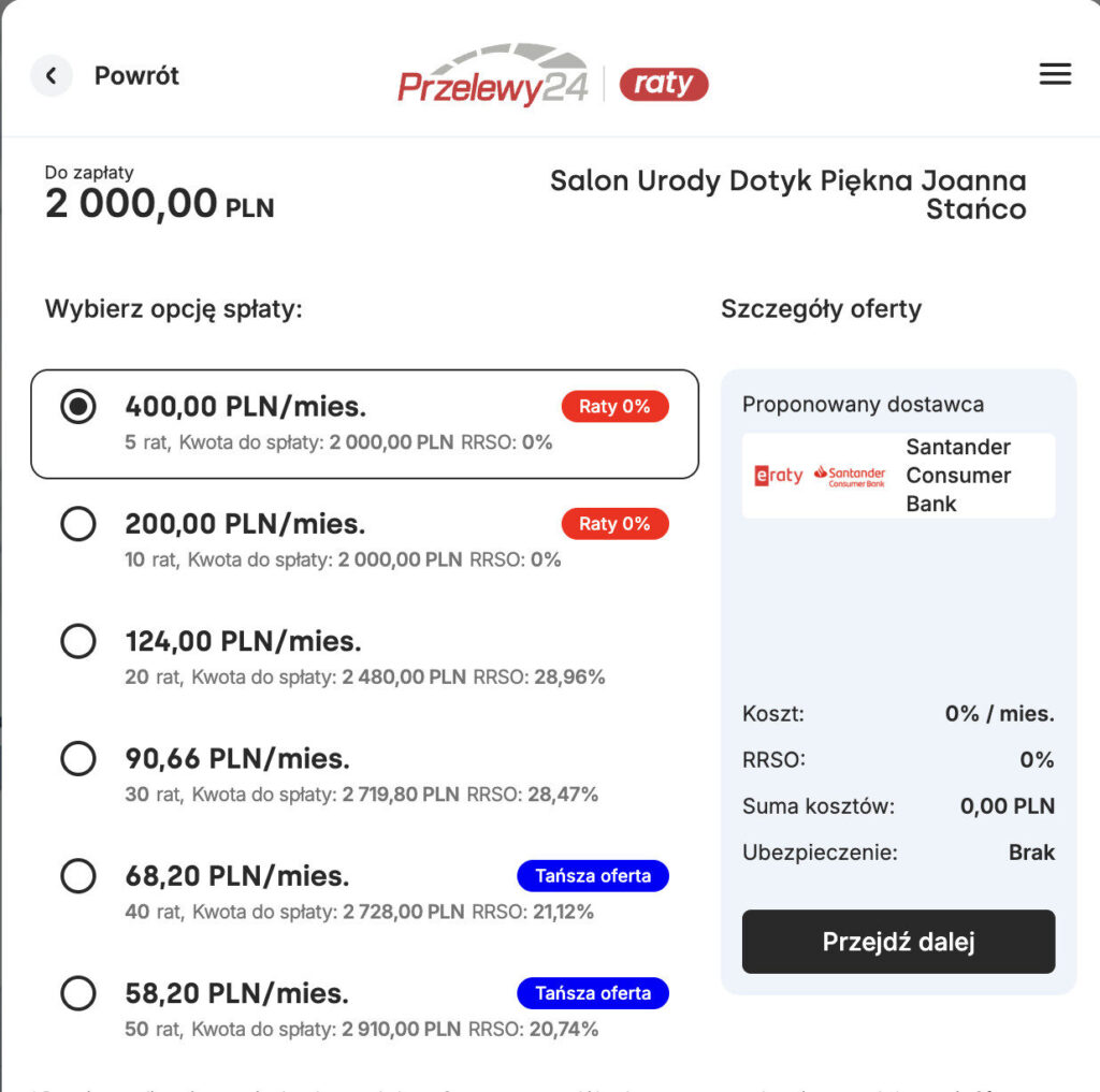 Wybierasz płatność Przelewy24 – Raty 0%.